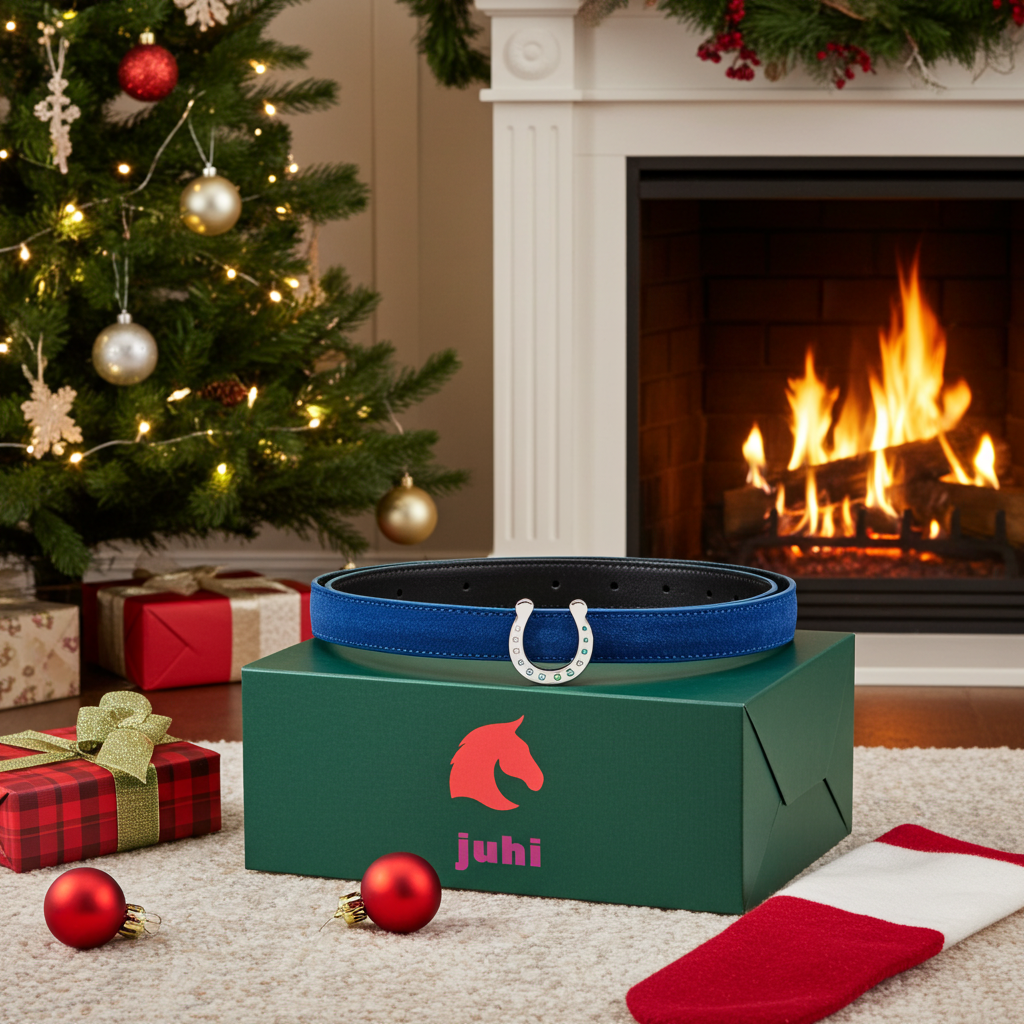 Inspiriert von der edlen Eleganz des Reitsports ist dieser wunderschöne Gürtel mit austauschbarer Schnalle eine atemberaubende Ergänzung für jedes Outfit. Die Schnalle in Form eines Hufeisens, besetzt mit Swarovski-Steinen in kühlen Grün- und Blautönen, verleiht dem Gürtel eine interessante Kontur.