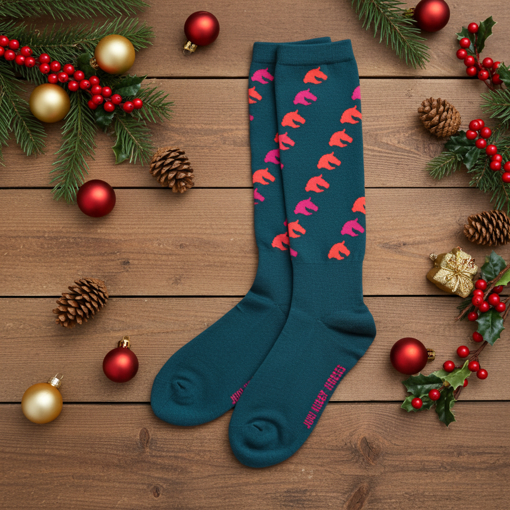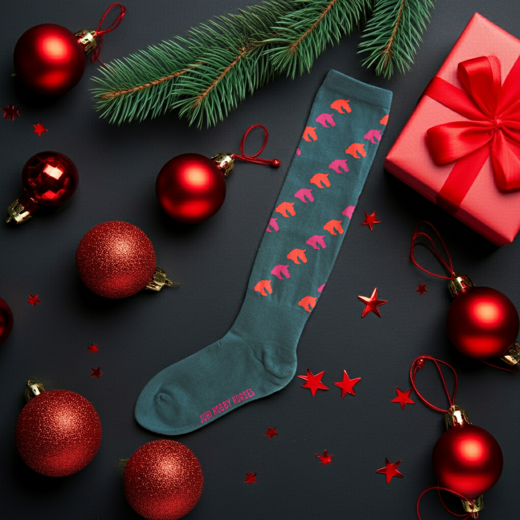 Kniestrümpfe für Hobbyhorsing grün mit Pferdemotiv
